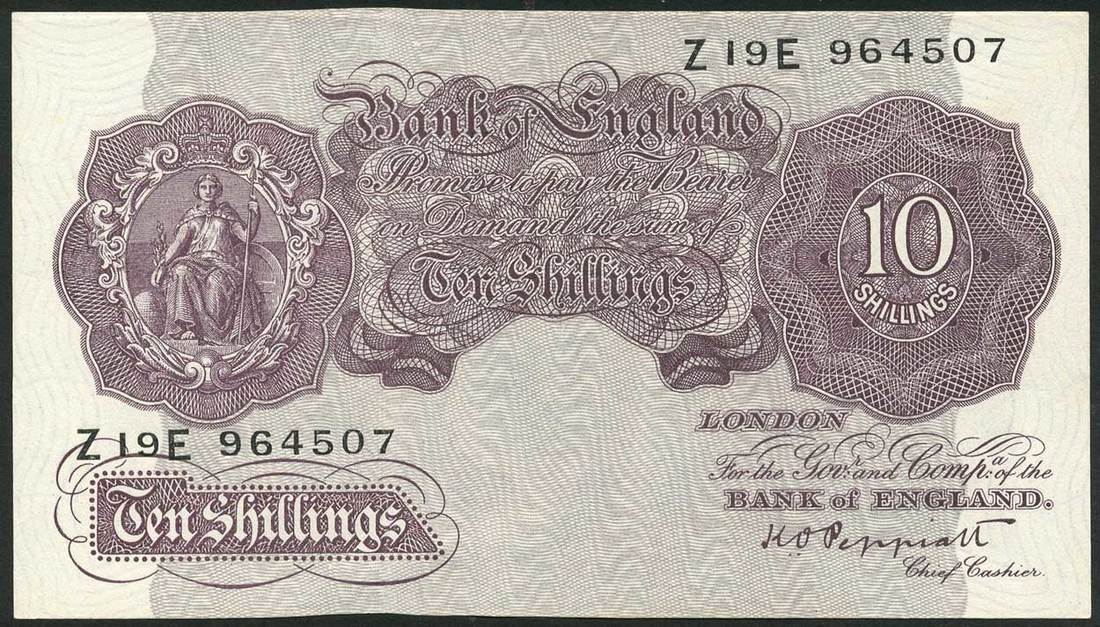 Bank of England, K.O.Peppiatt, 10 shillings (6), ND (1940), mauve, ornate crowned vignette of Britannia at left, value at right