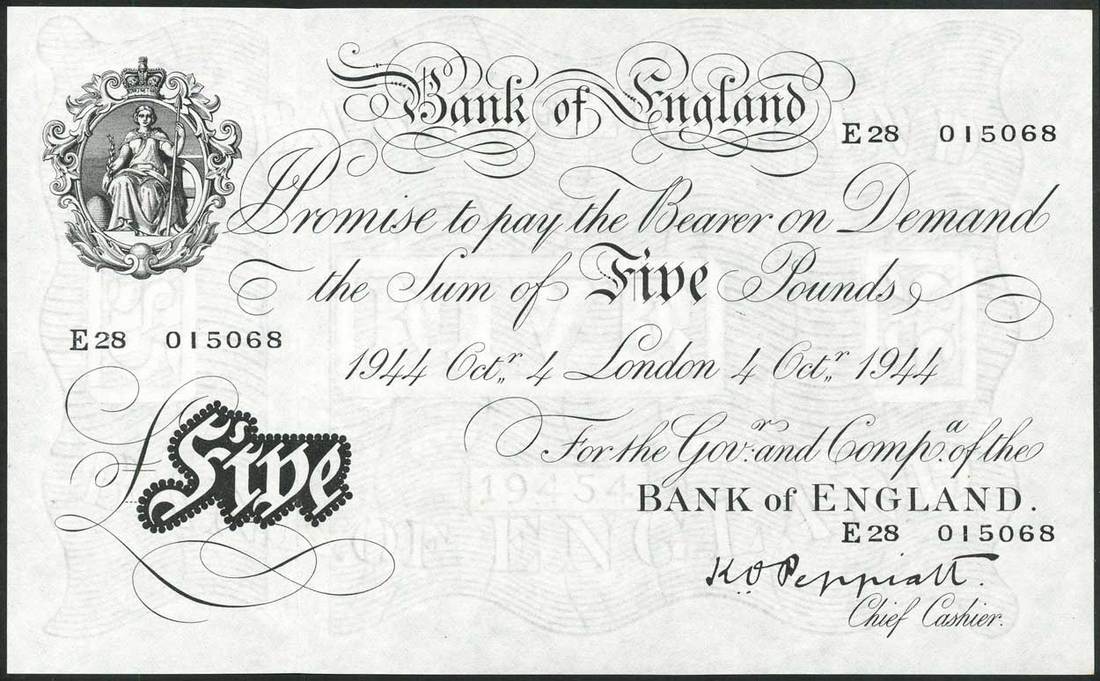 Bank of England, K O Peppiatt, consecutive pair £5, 4 October 1944, serial number E28 015068, black and white, seated Britannia in elaborate frame top left, value in ornate black tablet low left, bank title top centre