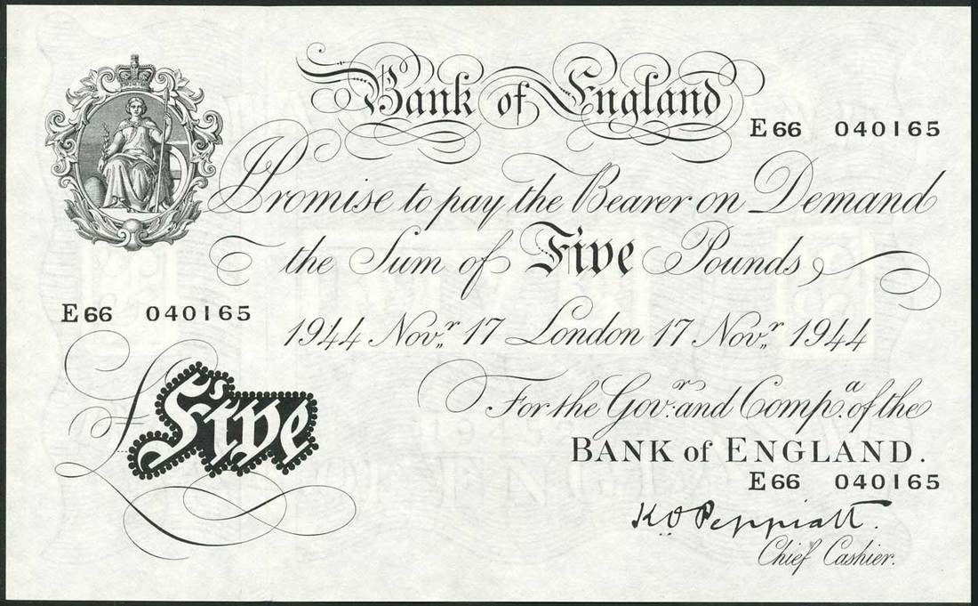 Bank of England, K O Peppiatt, £5 (2), 17 November 1944, serial number E66 040165, 21 November 1944, serial number E69 033487, black and white, seated Britannia in elaborate frame top left, value in ornate black tablet low left, bank title top centre