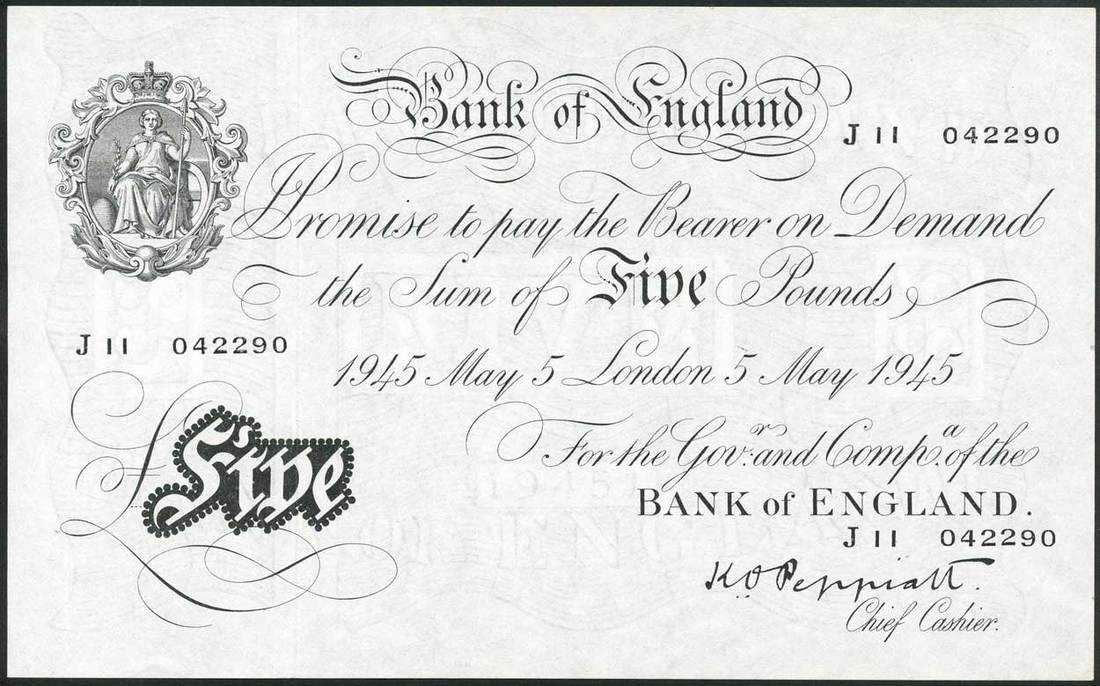 Bank of England, K.O.Peppiatt, £5 (2), London, 1945, prefixes J11 and K21, black and white, ornate crowned vignette of Britannia at top left, value in black tablet at low left