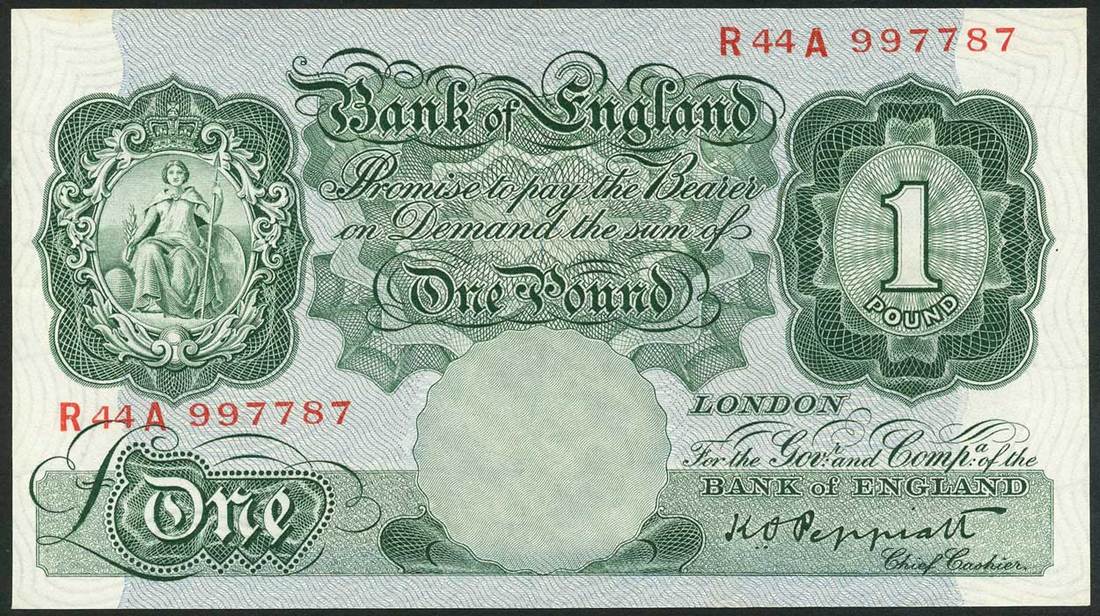 Bank of England, K O Peppiatt, £1 (8), ND (1948), serial numbers R44A 997778, R73A 357109, S01A 459140, S33A 734550-1, S37A215602-3, green, seated Britannia at left, value low left, centre and top right, reverse, blue, pink and green, bank building top centre