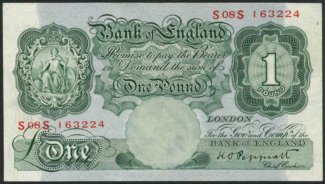 Bank of England, K O Peppiatt, £1 (2), ND (1934), serial numbers S01S 006451 and S08S 163224, green, seated Britannia at left, value low left, centre and top right, reverse, blue, pink and green, bank building top centre