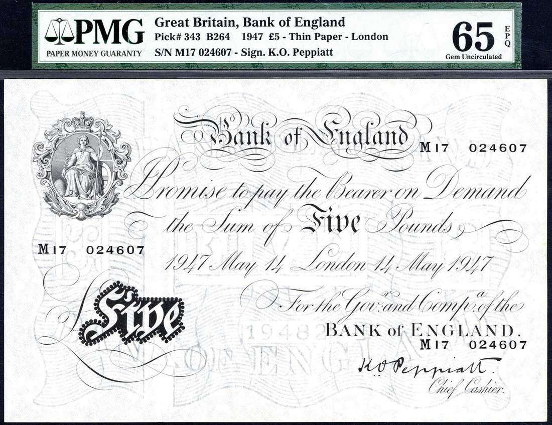 Bank of England, K O Peppiatt, £5, 14 May 1947, serial number M17 024607, black and white, seated Britannia top left, bank title top centre, value in ornate black tablet low left
