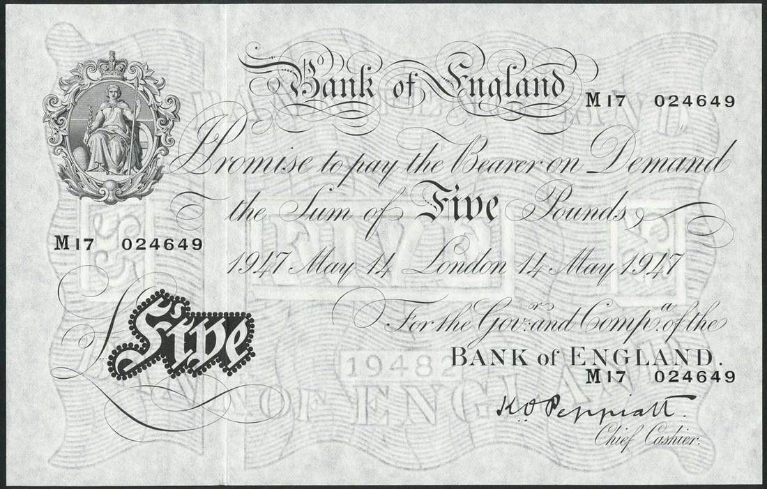 Bank of England, K.O.Peppiatt, £5 (3), London, 1947, serial number M17 024647/648/649, black and white, ornate crowned vignette of Britannia at top left, value in black tablet at low left