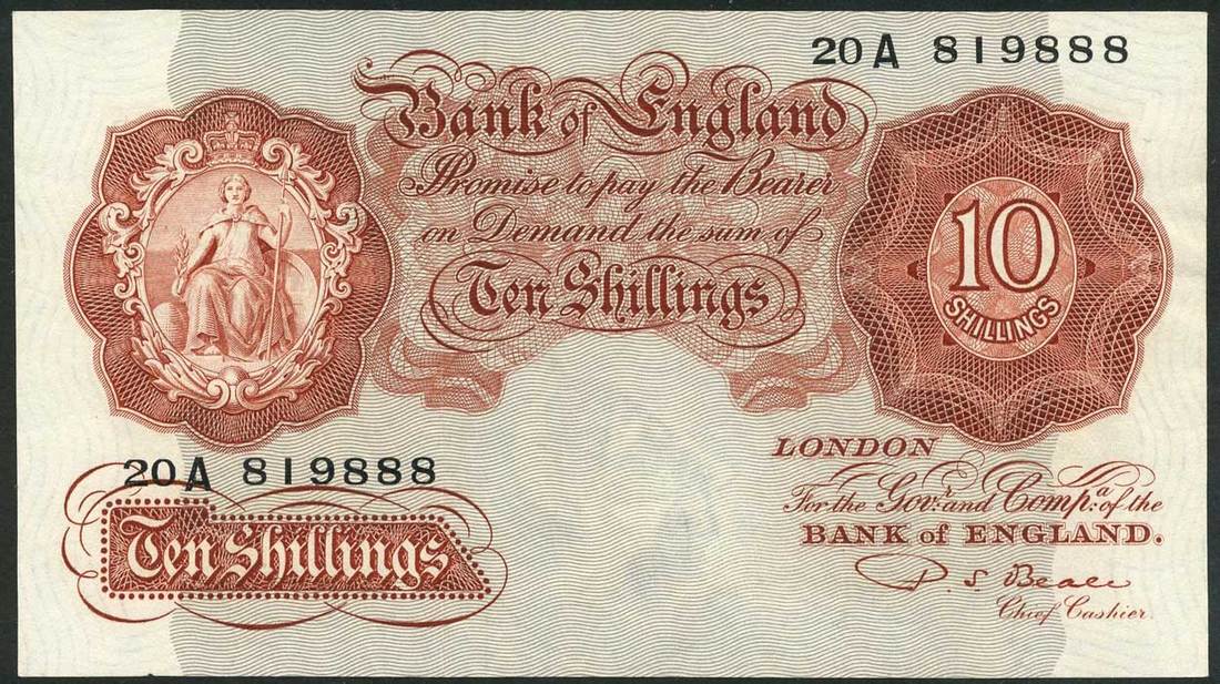 Bank of England, P.S Beale, 10 shillings, ND (1950), suffix 20A, brown, ornate crowned vignette of Britannia at left, value at right