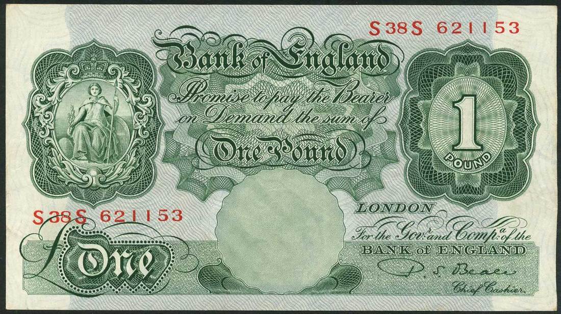 Bank of England, P S Beale, a group of £1 (33), ND (1950), prefixes E05C, J05C (5), L48C, L37C (9), S27C (3), W41C, X63C (3), X98C (3), X99C (2), Y01C, Y08C, C79J, L44J, A08J, S38S, green, seated Britannia at left, value low left, centre and top right, reverse, blue, pink and green, bank building top centre