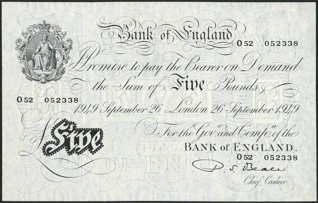 Bank of England, P.S.Beale, £5 (3), London, 1950 (2), 1951, prefixes O, R and T, black and white, ornate crowned vignette of Britannia at top left, value in black tablet at low left