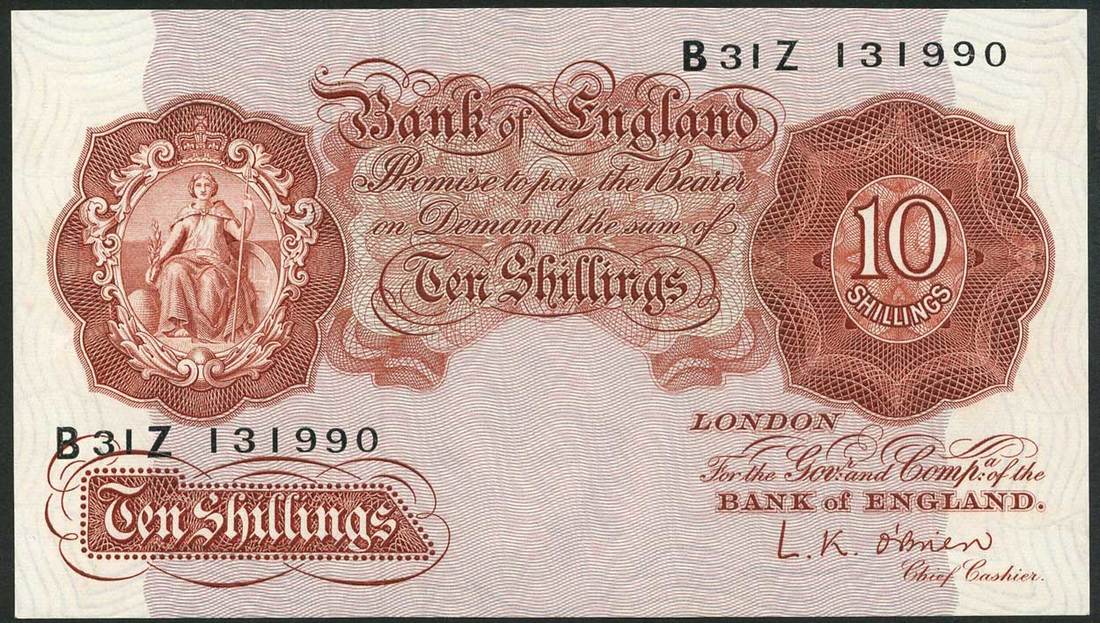 Bank of England, L K O'Brien, 10/- (18), ND (1955), prefixes A25Z, B31Z, A14Y (3), D86Y, E57Y (2), O09Y (2), R45Y, Y06X, Z95X, Z35X (4), replacement 60A, 10/-, ND (1961), prefix B98, red-brown, crowned Britannia at right, value in guilloche at left and in panel low left