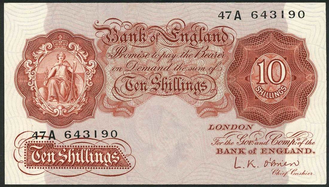 Bank of England, L.K.O'Brien, 10 shillings, ND (1955), suffix 47A, brown, Britannia at left, value at right
