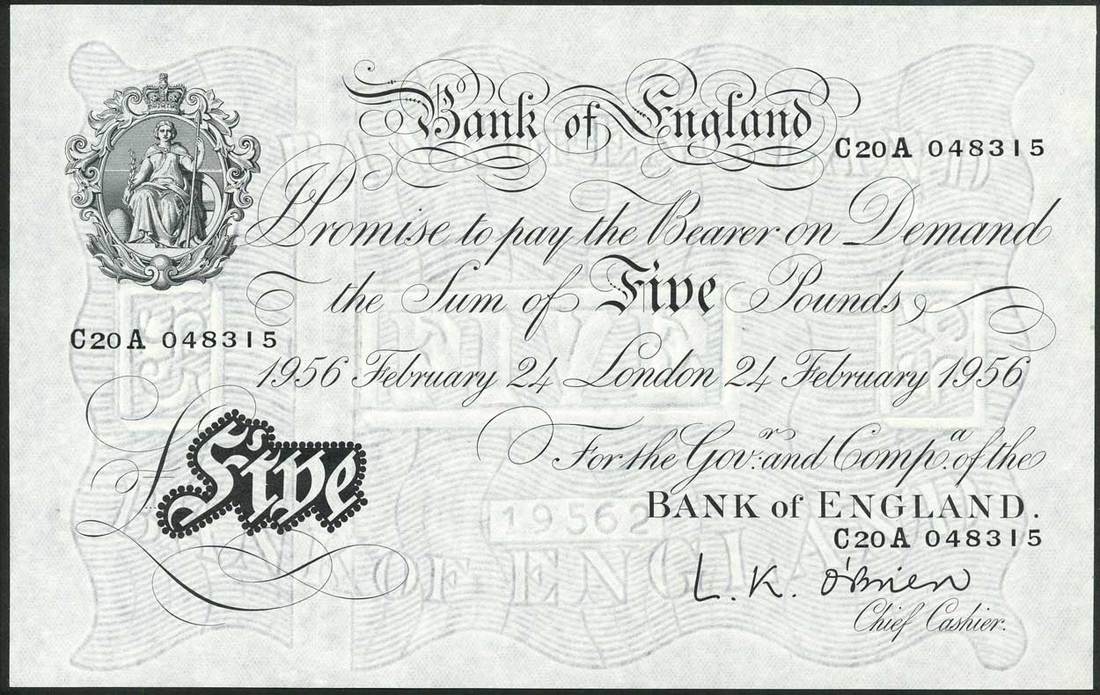 Bank of England, L K O'Brien, consecutive £5 (2), 24 February 1956, serial number C20A 048315-6, black and white, seated Britannia in elaborate frame top left, value in ornate black tablet low left, bank title top centre