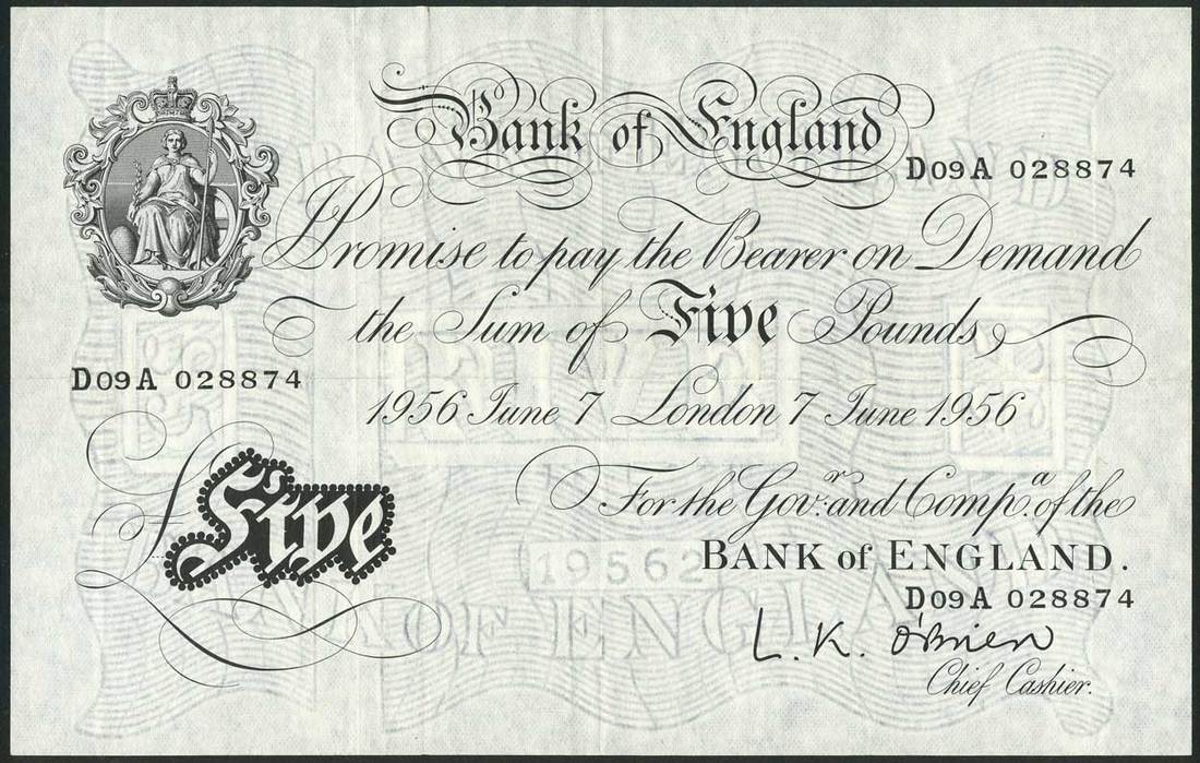 Bank of England, L.K.O'Brien, £5 (3), London, 1955 (2), 1956, prefixes A89A, C20A and D09A, black and white, ornate crowned vignette of Britannia at top left, value in black tablet at low left