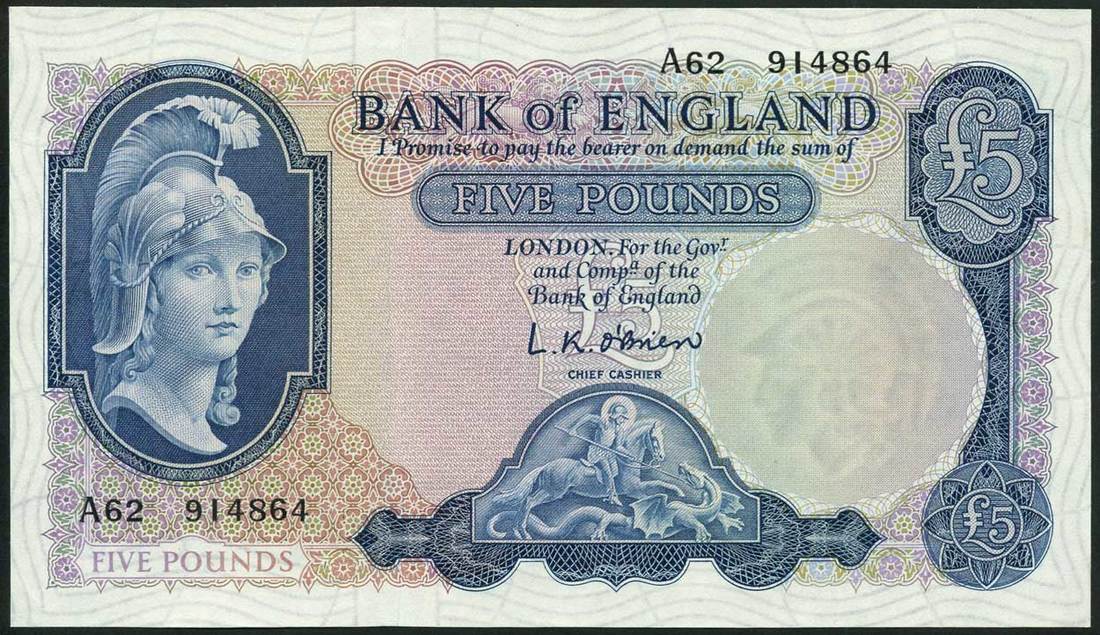 Bank of England, L.K.O'Brien, £5 (5), 21 February 1957, prefixes A62, A63, A69, A93 (two consecutive), blue on multicolour underprint, helmeted Britannia at left, St George and dragon at low centre, reverse blue, lion and key