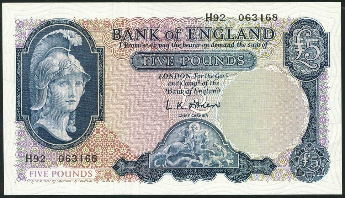 Bank of England, L.K.O'Brien, £5 (8), ND (1961), serial numbers H92 063162/3/4/5/6/7/8/9, blue and multicoloured, Britannia at left, Saint George and the dragon low centre