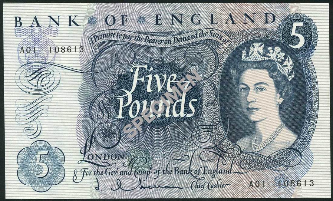Bank of England, J Q Hollom, £5 (3), ND (1963), serial numbers A01108613, A01 108638, A01 858593, blue, portrait Queen Elizabeth II at right, value at low left, centre and top right, reverse, seated Britannia at centre
