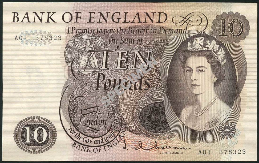 Bank of England, J Q Hollom, consecutive £10 (2), ND (1964), serial number A01 578322-3, brown and light orange, portrait Queen Elizabeth II at right, seated Britannia low left, value top left and right and at centre left, reverse, lion at centre