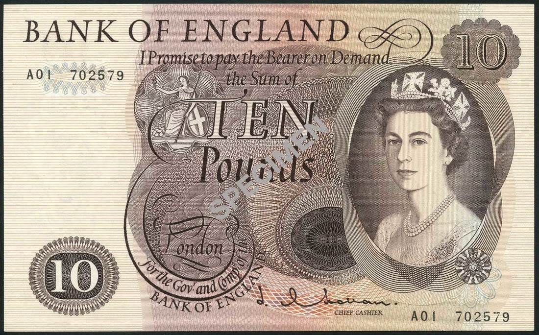 Bank of England, J Q Hollom, £10 (7), ND (1964), all with prefix A01, brown and light orange, portrait Queen Elizabeth II at right, seated Britannia low left, value top left and right and at centre left, reverse, lion at centre