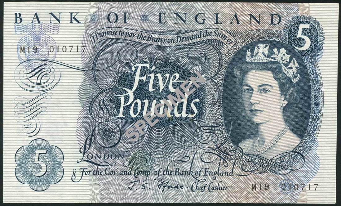 Bank of England, J.S.Fforde, £5, ND (1963), prefix M19, blue, Elizabeth II at right