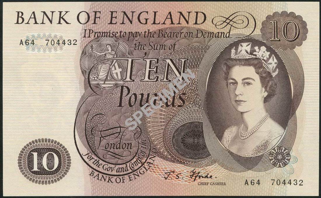 Bank of England, J. S. Fforde, £10 (6), ND (1967), prefixes A45, A54, A64, A67, A86, A90, brown on multicolour, Queen Elizabeth II at right, seated Britannia top centre left, reverse, lion with key