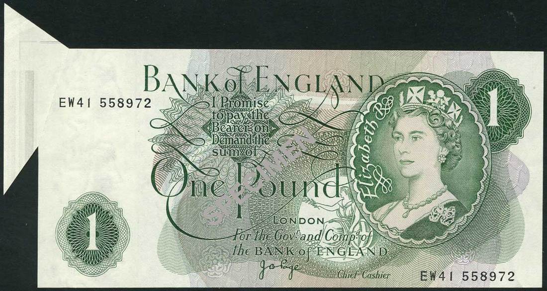 Bank of England, J B Page, ERROR: £1, ND (1970), serial number EW41 558972, green, portrait Queen Elizabeth II at right, value at centre with bank title above, value in ornate tablets low left and top right, reverse, seated Britannia