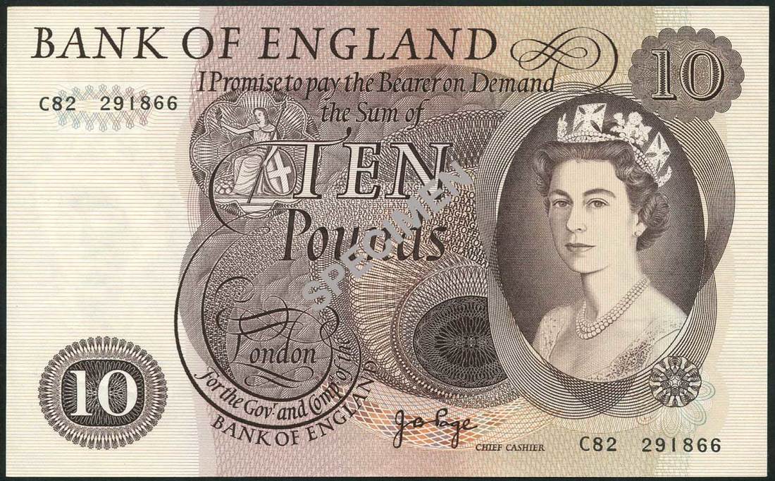 Bank of England, J B Page, £10 (10), ND (1970), prefixes B08, B45 (2), B72, C15, C21, C23, C54, C58, C82, brown on multicolour, Queen Elizabeth II at right, seated Britannia top centre left, reverse, lion with key