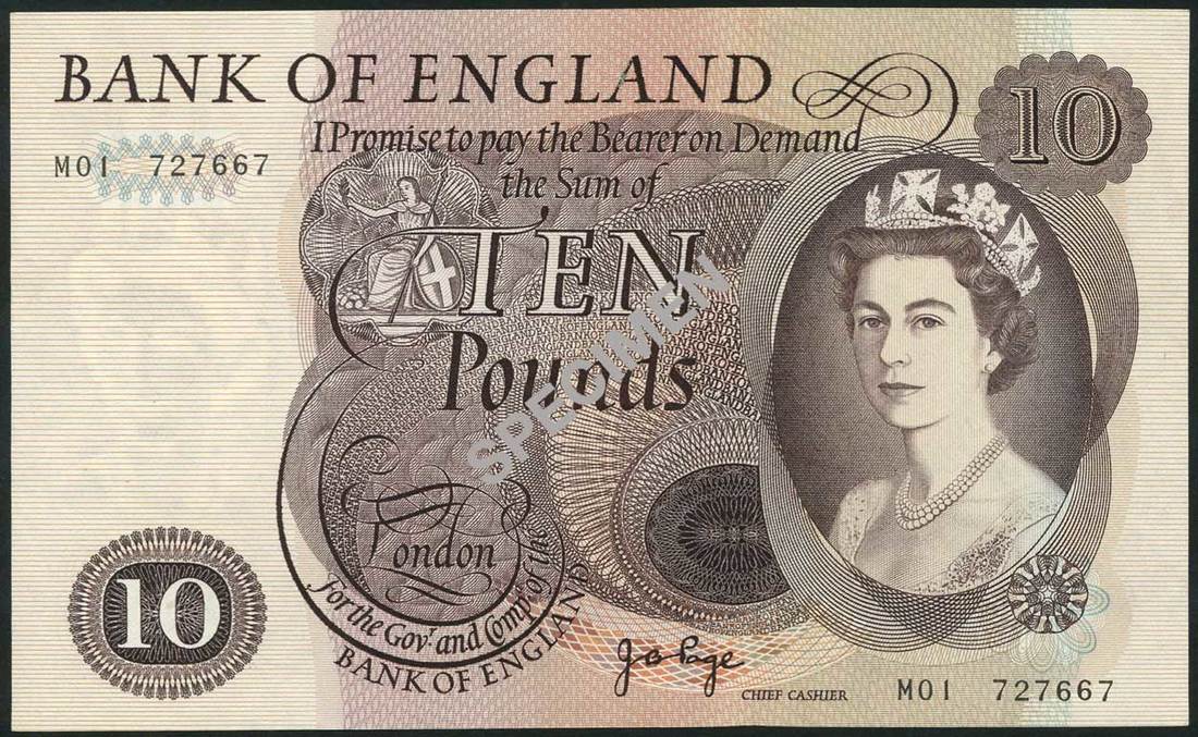 Bank of England, J.B.Page, £10 (3), ND (1967), serial numbers M01 717484, M01 727667, M06 480836, brown on multicolour, Queen Elizabeth II at right, seated Britannia top centre left, reverse, lion with key