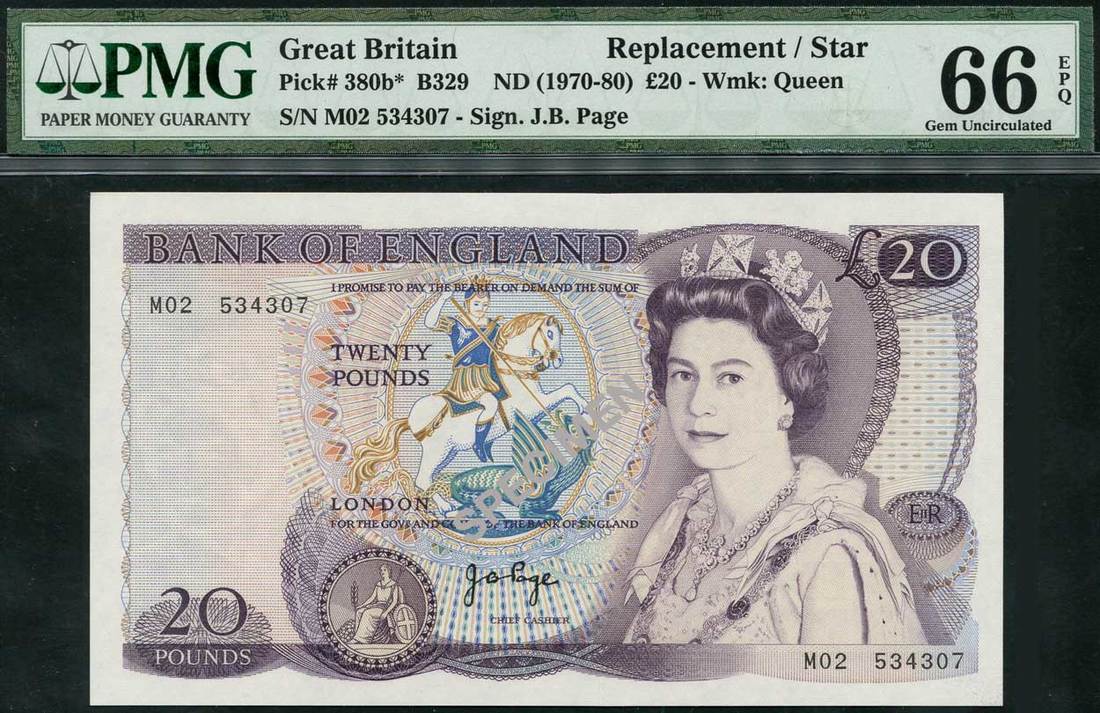 Bank of England, J B Page, £20, ND (1970-80), serial number M02 534307, purple and multicolour, portrait Queen Elizabeth II at centre right, St George and dragon at centre, seated Britannia low centre left, reverse, William Shakespeare
