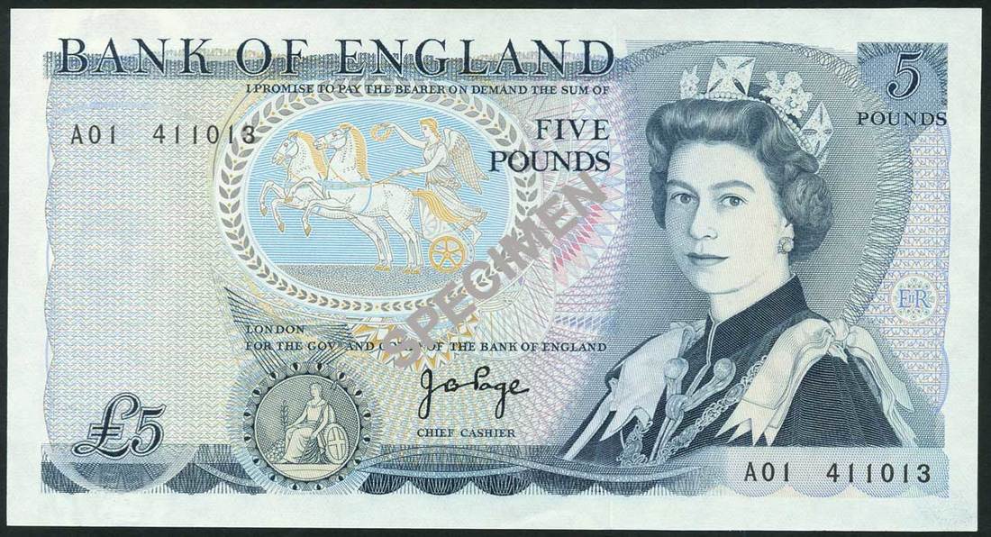 Bank of England, J.B.Page, £5, ND (1971), prefix A01, blue, portrait Queen Elizabeth II at right, also £5, ND (1973), prefix AN01