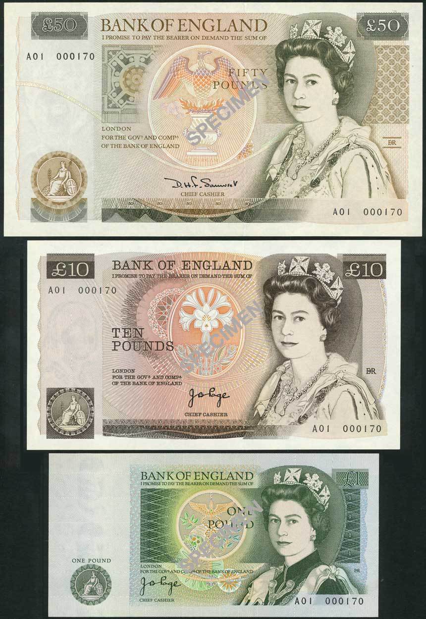 Bank of England, Page/Somerset, three notes with matching serial number A01 000170, £10, Page, ND (1975), brown, £1, Page, ND (1978), green, £50, Somerset, ND (1981), olive green, all with portrait Queen Elizabeth II at right, reverses, Florence Nightingale, Sir Isaac Newton and Sir Christopher Wren respectively