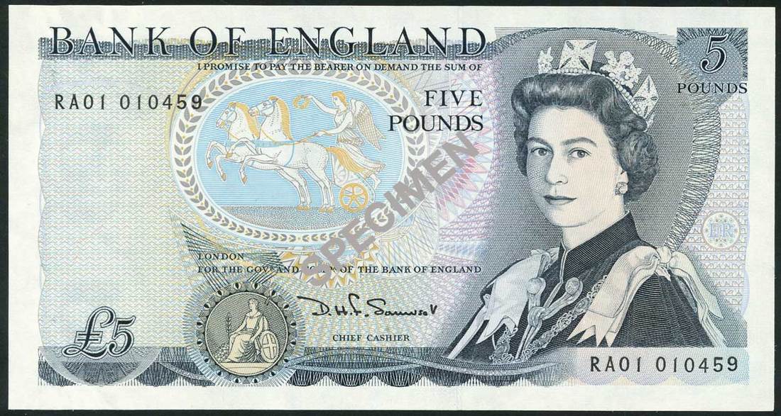Bank of England, D.H.F.Somerset, £5 (10), ND (1987), serial numbers RA01 010458-467, blue, Elizabeth II at right, Victory in biga at centre, arms low left