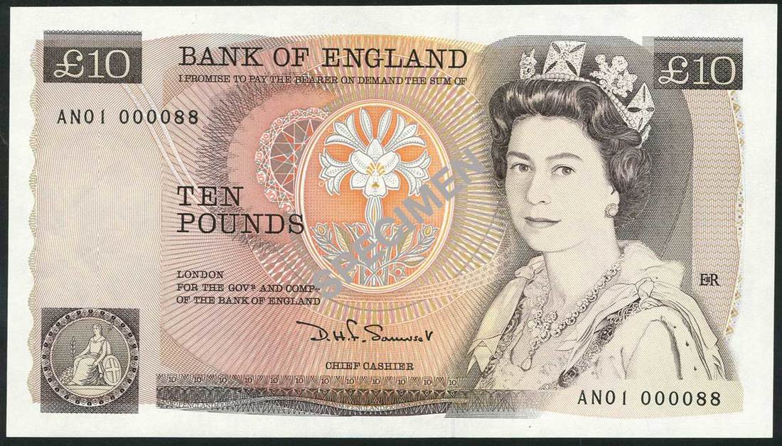 Bank of England, D.H.F.Somerset, £10, ND (1984), serial number AN01 000088, brown, portrait Queen Elizabeth II at right