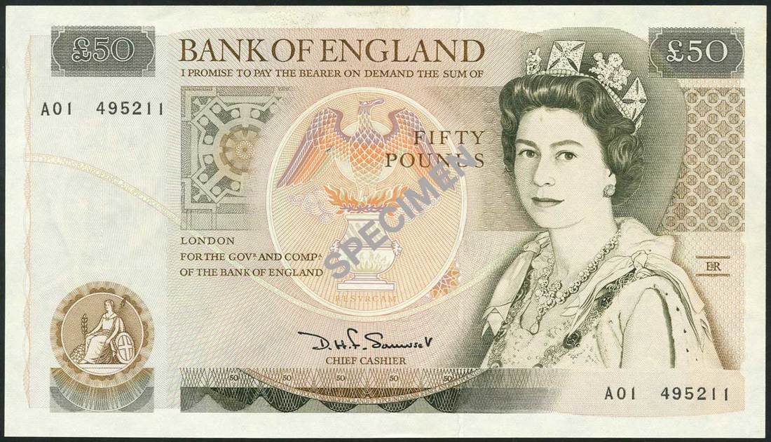 Bank of England, D.H.F.Somerset, £50 (2), ND (1981), serial numbers A01 495211 and B29 858124, brown on multicolour, Elizabeth II at right, phoenix at centre, Britannia at low left, reverse brown, Christopher Wren at right, St Pauls Cathedral at left
