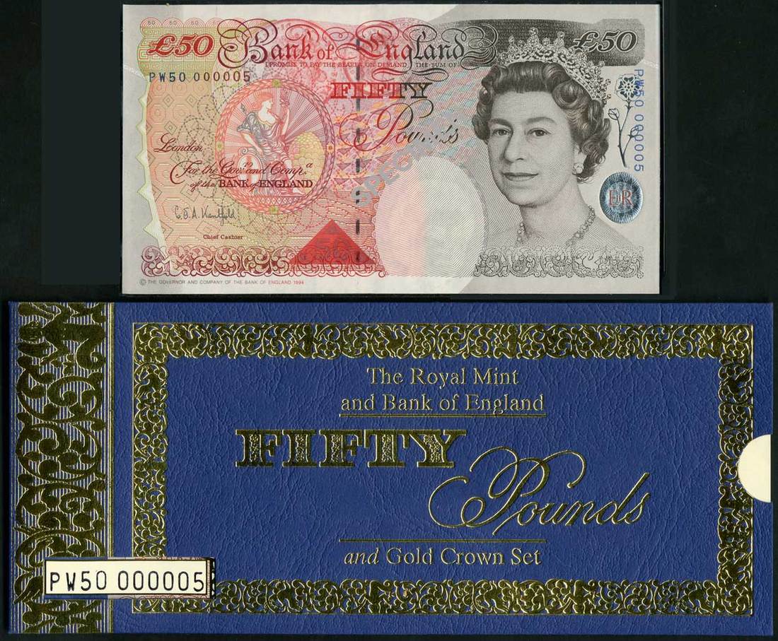 Bank of England, a presentation folder containing £50 in a plastic frame, ND (1998), serial number PW50 000005, red and multicoloured, Elizabeth II at right, Britannia at left, Kentfield signature