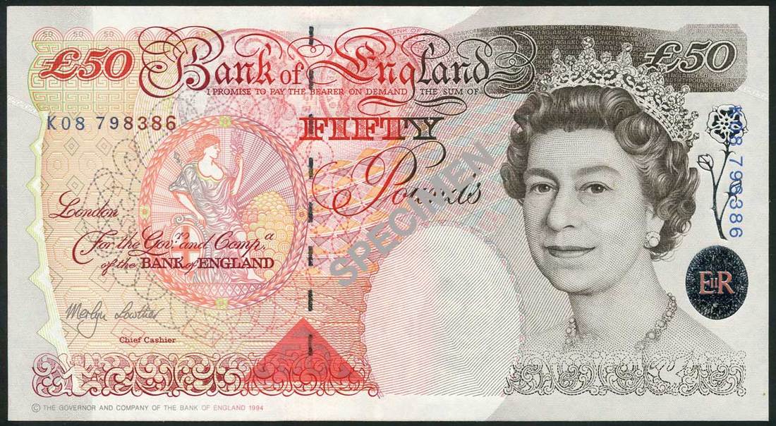 Bank of England, M V Lowther, £5 (4), ND (1999), prefixes EA01 (3), ED65, £10 ND (1999), prefixes KL01 (3), KL65, £20, ND (1999), serial number DA01 000811, £50 (7), serial number K08 798381-7, all with Queen Elizabeth II at right