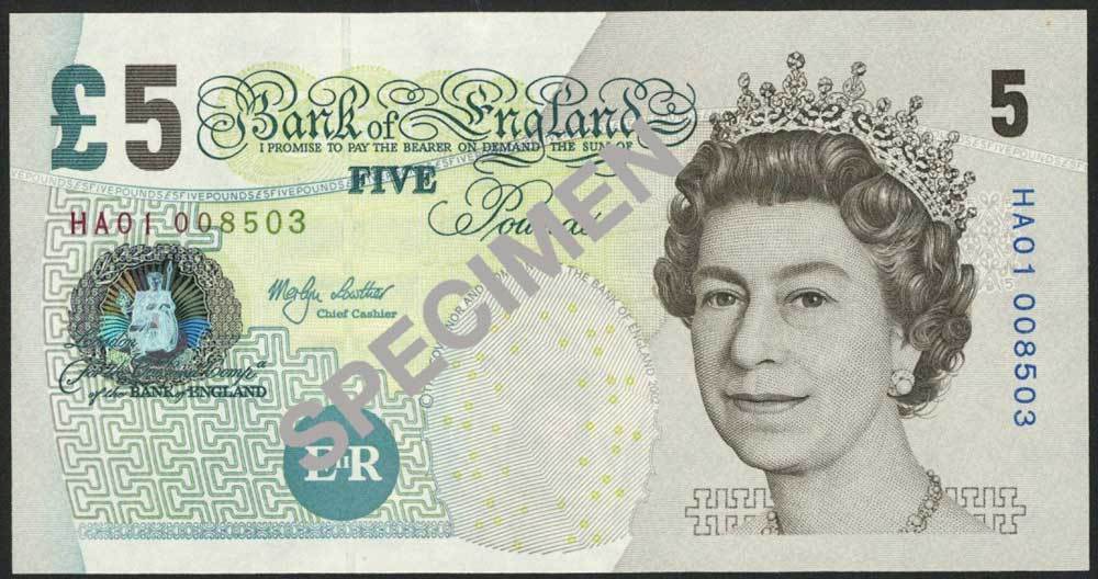 (x) Bank of England, M V Lowther, £5 (3), ND (2002), consecutive serial numbers HA01 008501-3, turquoise and light green, portrait Queen Elizabeth II at right, seated Britannia at left, bank title top centre left, value top left and right, reverse, Elizabeth Fry at right