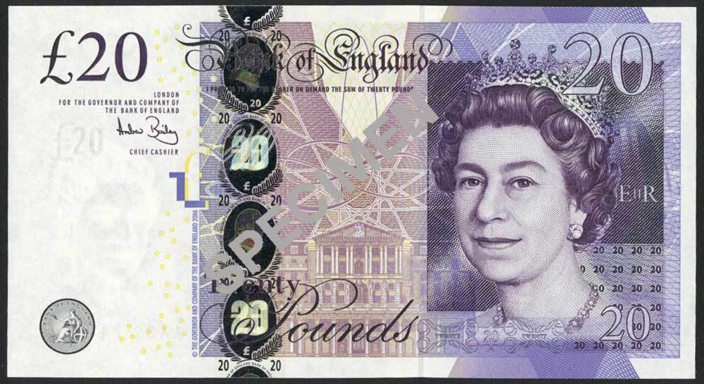 Bank of England, A Bailey, £20, ND (2007), prefixes AA01, AB01 000111, AB01 000222, AB01 000333, AA32, AA36 (2), AA71, AB48 (3), purple print, Queen Elizabeth II at right