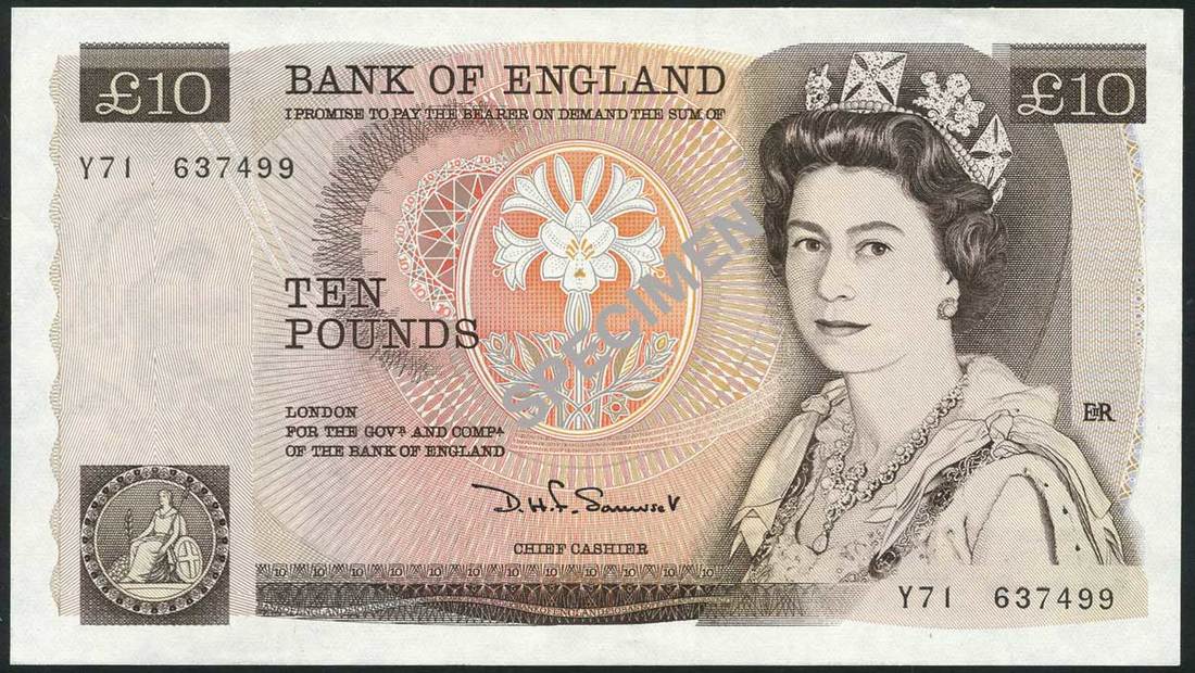 Bank of England, £10 (5), Page, Somerset (2), Gill, Kentfield, brown, Elizabeth II at right, lily top centre