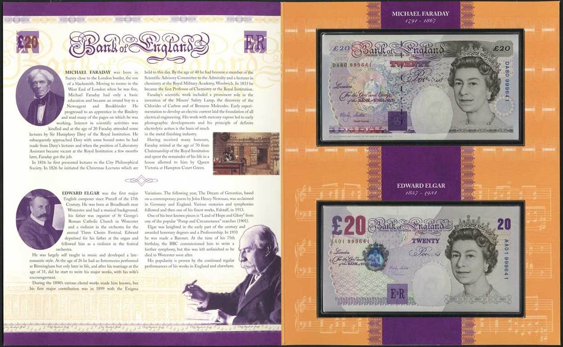 Debden presentation folder comprising 'Firsts and Lasts' £5, prefix DL99, £10, prefix KK99, £20, prefix CL99 and £20, prefix H99, also a folder containing £20 'First and Last', prefixes DA80 and AA01, also a 'Royal Celebration' uncut pair of £5, prefixes HM02 and HM03