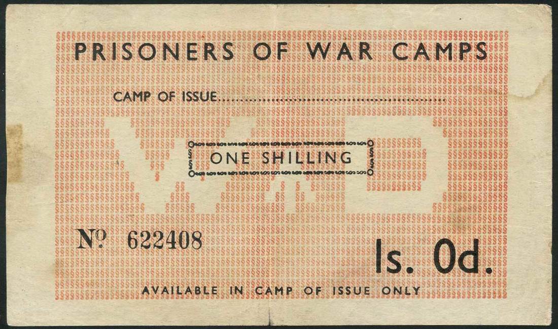 Prisoner of War camp money, no place of issue, 6D, serial number A 999728, green, WD (War Department) in underprint at centre, also 1/-, serial number 622408, pink-orange