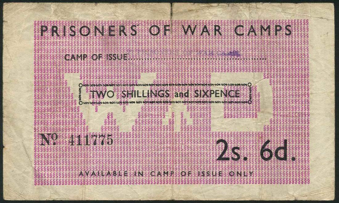 Prisoner of War Camp No.27, Ledbury, Herefordshire, 2/6, serial number 411775, lilac, WD (War Department) in underprint at centre