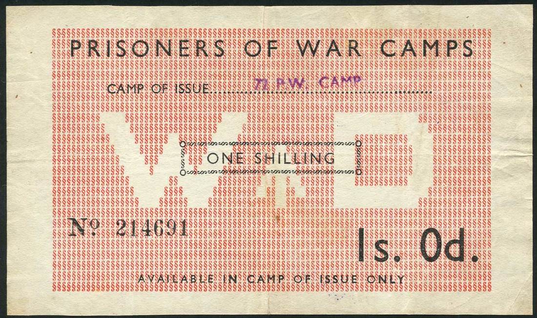 Prisoner of War Camp No.72, Ducks Cross Camp, Colmworth, 1/-, serial number 214691, pale pink, WD (War Department) in underprint at centre, also another example, Camp No.79, Moorby, Boston, serial number 298577, as previous