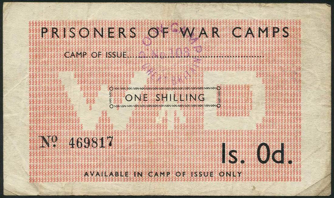 Prisoner of War Camp No.108, Thirkleby, Thirsk, 1/-, serial number 469817, pale pink, WD (War Department) in underprint at centre