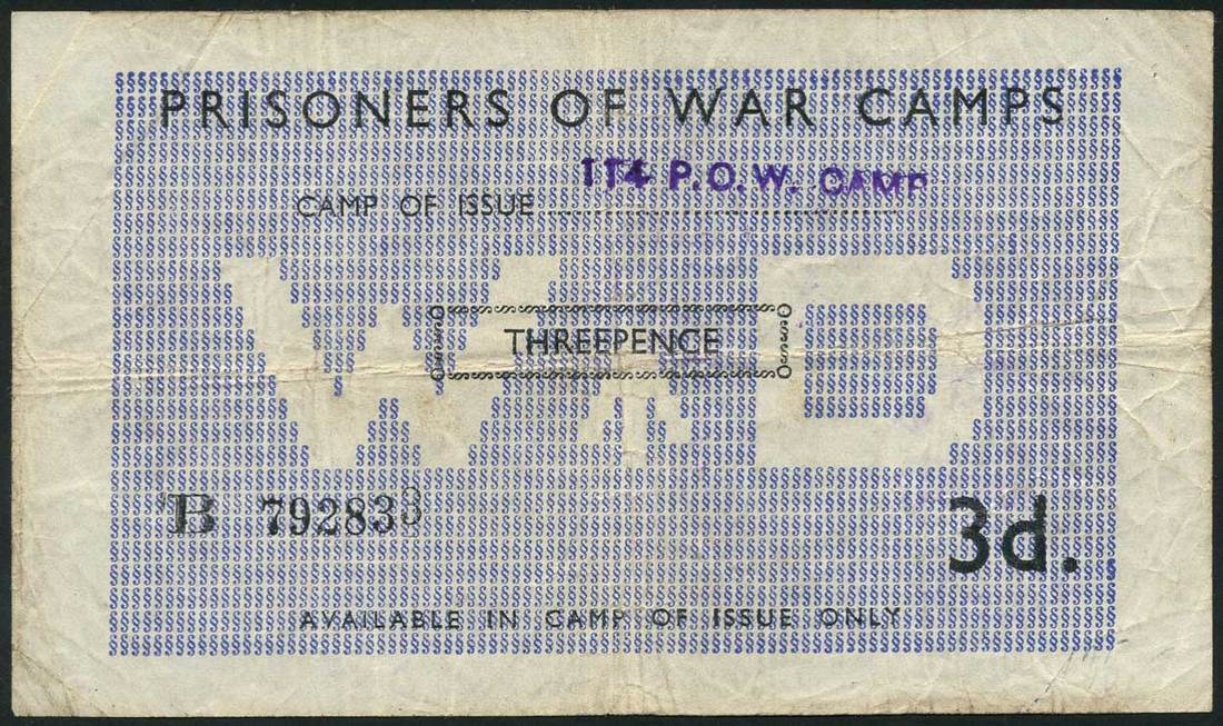 Prisoner of War Camp No.114 Eden Vale, Westbury, 3D, serial number B 792838, pale blue, WD (War Department) in underprint at centre