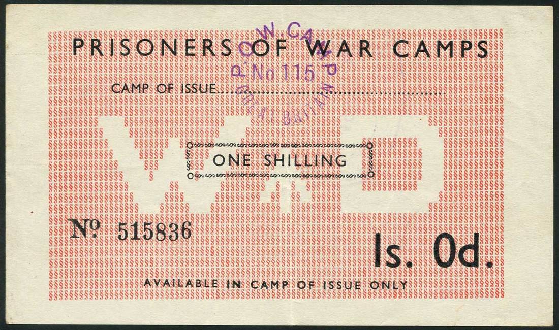 Prisoner of War Camp No.115, White Cross, Saint Columb Major, 1/-, serial number 515836, pale pink, WD (War Department) in underprint at centre