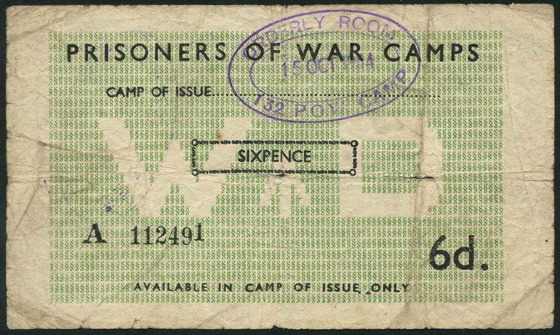 Prisoner of War Camp No.119, Pabo Hall, Llandudno Junction, 3D, serial number A 082648, pale blue, WD (War Department) in underprint at centre, also 6D, camp 132, Kimberley Park, Kimberley, green