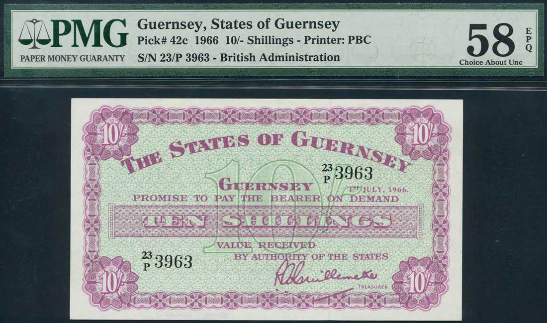 States of Guernsey, 10 shillings (7), 1 July 1966, serial numbers 23/P 3962-3968, pink on green underprint, value at centre and each corner
