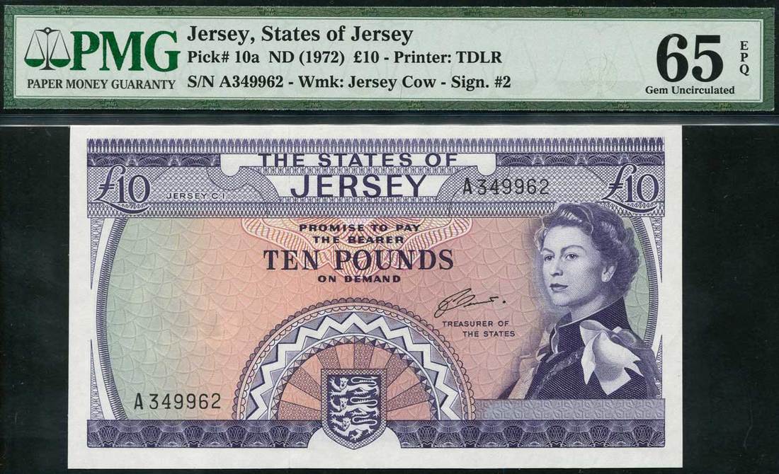 States of Jersey, £10, ND (1972), serial number A 349962, purple on light green and pink underprint, portrait Queen Elizabeth II at right, arms low centre, value top left, right and at centre, reverse, St Ouen's Manor