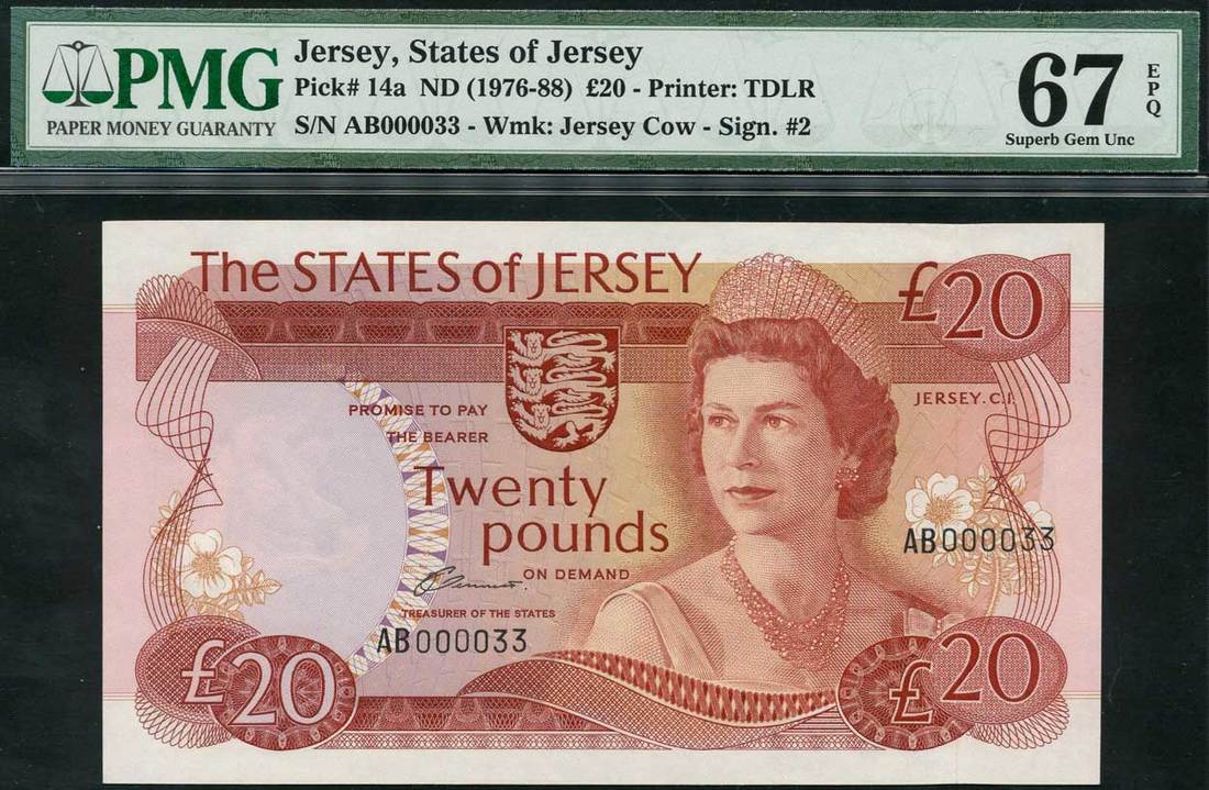 States of Jersey, £1, £5, £10, £20, ND (1976-88), all with serial number AB 000033, grey, brown, green and red respectively, all feature portrait Queen Elizabeth II at right, Clennet signature,