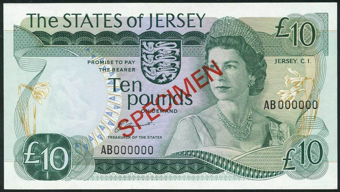 States of Jersey, £5, ND (1983), serial number GB275300, specimen £10, ND (1976), serial number AB000000, brown and green respectively, portrait Queen Elizabeth II at centre right, arms top centre, flowers at left, reverses, illustrations of Elizabeth Castle, Victoria College