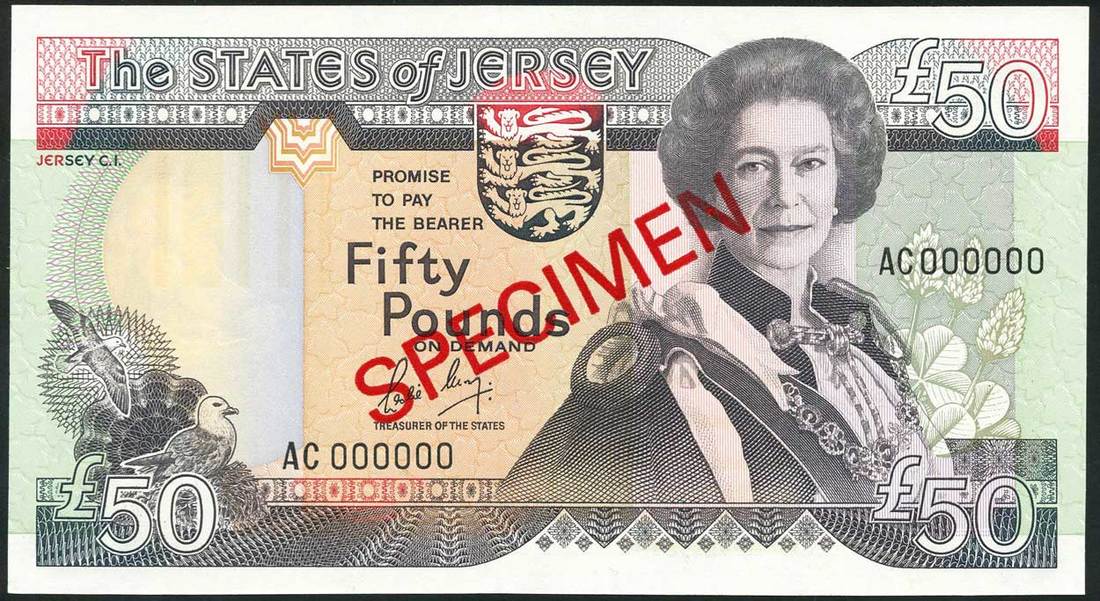 States of Jersey specimen £10, £20 and £50, ND (1989) zero serial numbers, red, blue and dark grey on multicolour underprint respectively, all feature portrait Queen Elizabeth II at right, arms top centre, reverses, illustration of Battle of Jersey, St Ouen's Manor and Government House respectively