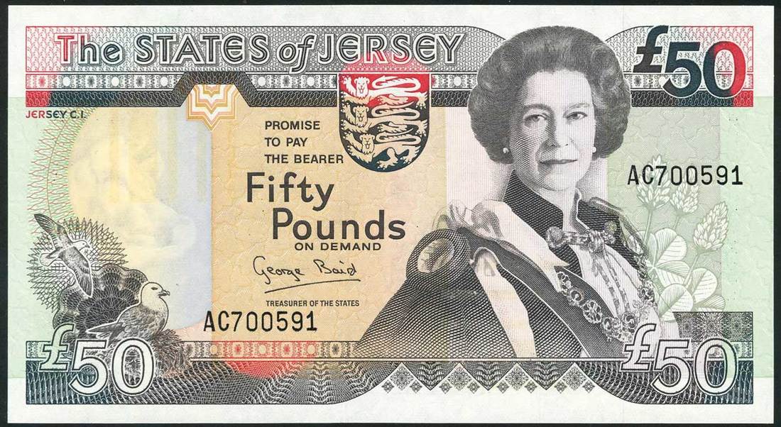 States of Jersey, £50 (3), ND (1989), serial numbers AC 700591/592/593, black, green and multicoloured, Elizabeth II at right, fulmars at left, Baird signature